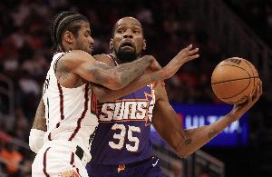 值得一提的是,本赛季前的火箭太阳大交易主角的另外一位杜兰特,在昨日的G2复出,但表现先扬后抑,最终12中7拿到23分6板4助,但全场出现9次失误!9次失误也平了杜兰特生涯季后赛单场失误数纪录。