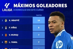 据德国转会市场统计,姆巴佩本赛季西甲客场打进14球,西甲球员之中最多。
