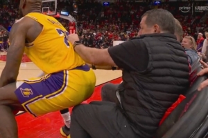 GIF-詹姆斯救球后臀部久对某位男球迷