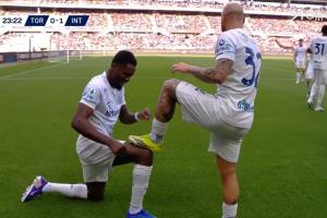 破门后,图拉姆为迪马尔科擦鞋庆祝。