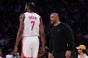 体育资讯4月27日讯 火箭今日G4再战湖人,他们前三场全部失利。赛前,火箭主帅乌度卡接受媒体采访时,谈到了杜兰特的情况,后者确认继续缺阵。