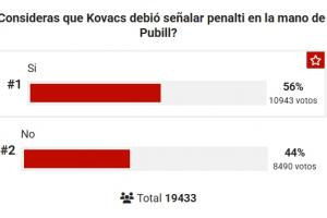 截至目前有19433人参与投票,56%的人认为普比尔手球该被判点球,44%的人认为不是点球。