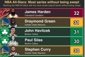从未被横扫过的球员谁打的系列赛最多?哈登32轮第1 追梦2库里4