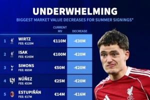 去年夏窗新援身价下跌榜:维尔茨-3000万欧居首,伊萨克-2000万欧