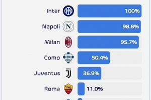 体育资讯4月9日讯 意甲第31轮比赛之后,国米以7分的优势领跑积分榜。足球数据分析机构Football Meets Data对各队进入前4的概率进行了预测,国米、那不勒斯和米兰基本确定前四位置,科莫50.4%,尤文36.9%,罗马仅有11%。