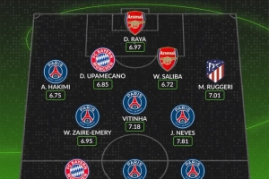 后卫:阿什拉夫(巴黎,6.75分)、于帕梅卡诺(拜仁,6.85分)、萨利巴(阿森纳,6.72分)、鲁杰里(马竞,7.01分)